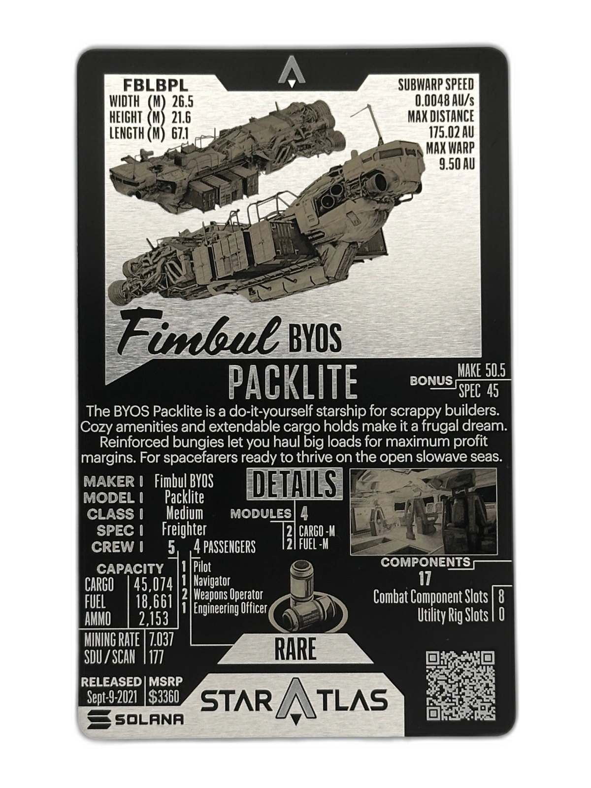 The Fimbul BYOS Packlite, a Star Atlas freight ship, is now immortalized as a premium laser-engraved metal card. This spacecraft celebrates the rugged spirit of DIY mechanics and cargo haulers who aren’t afraid to get their hands dirty.
