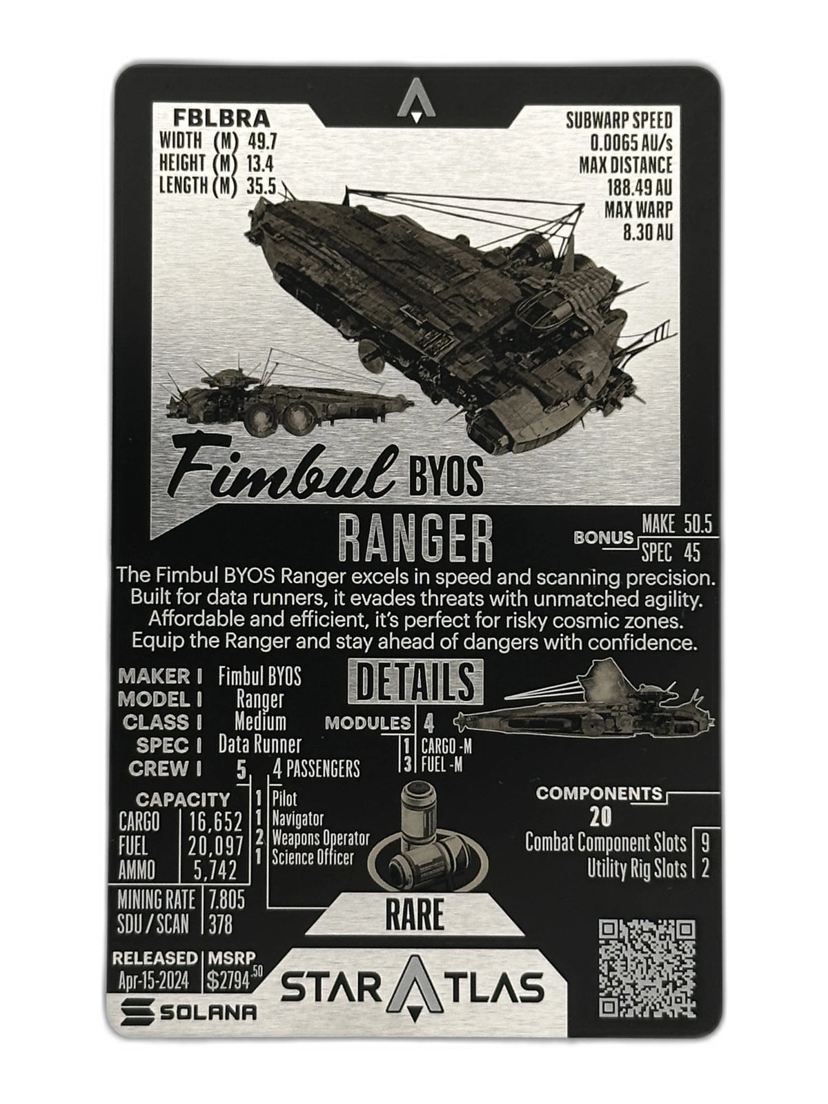 The Fimbul BYOS Ranger, a groundbreaking medium data runner ship, is now immortalized as a premium laser-engraved metal card. Designed for those who navigate the galaxy’s dangers with wisdom and speed, the Ranger is the industry’s most affordable data runner in its class, and a must-have for those who command information as a strategic asset.